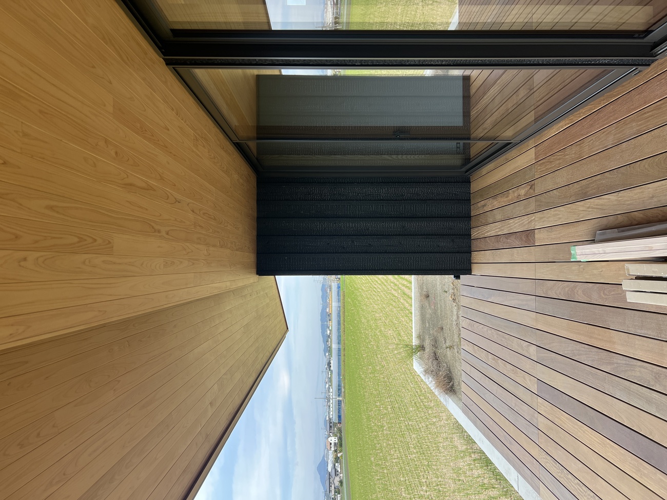 外壁は焼杉貼り、玄関ポーチの門扉は桧の小幅板貼りとした。